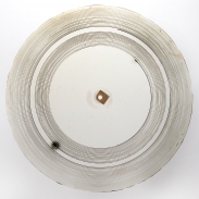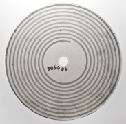 Disc 2 – 287686This recording of the test word “barometer” repeated several times is one of the few Volta Laboratory recordings that had already been heard in living memory before December 2011, thanks to an earlier playback effort by Floyd Harvey. It was recorded on November 17, 1884, using the fourth of four recording techniques described in U. S. Patent 341,213: a wide stylus attached to a diaphragm caused variations in the height of a narrow slit through which light passed on its way to a rotating round glass photographic plate, exposing a spiral “saw-tooth” trace of varying width. Like many of the Smithsonian’s photographic glass disc recordings, this one is signed by Harry G. Rogers, an associate who helped Sumner Tainter with phonographic experiments in this period. Another recording made in the same way and on the same day—but not yet available for listening—features the word “phonography” instead of “barometer.” The speaker in both cases is probably Rogers. Earlier in 1884, Tainter and Rogers had begun making photographic glass disc recordings using modulated jets of bichromate of potash, but their experiments of October and November—including this disc—show them applying the same photographic approach to a more familiar diaphragm-and-stylus method of capturing sound vibrations from the air.